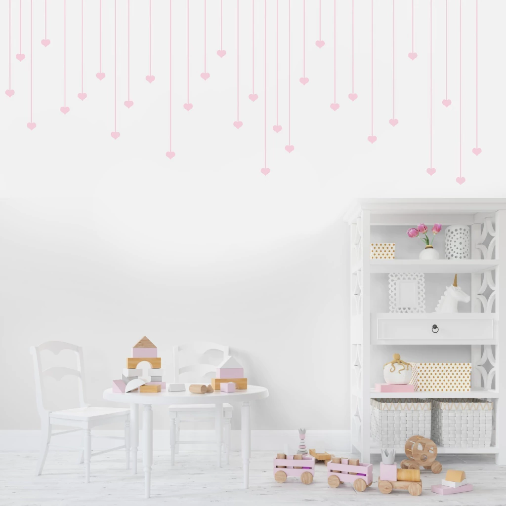 Transforme qualquer ambiente com um toque de carinho! Este adesivo é composto por 30 fios adesivos com corações pendurados, ideal para quem deseja adicionar um charme delicado às paredes. Perfeito para criar um ambiente acolhedor e personalizado, ele se adapta a diferentes alturas e espaços.