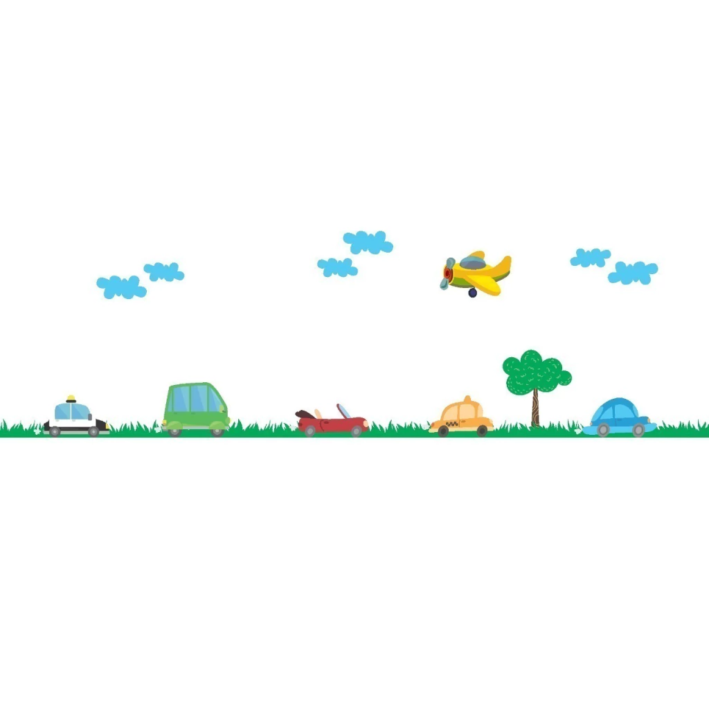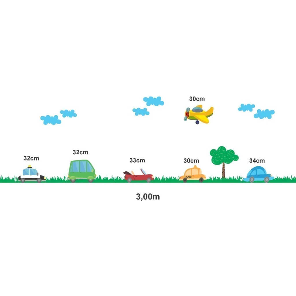 O adesivo contém 5 carrinhos, 1 avião, 1 árvore, nuvens e 3m de grama na versão G ou 2m de grama na versão P.