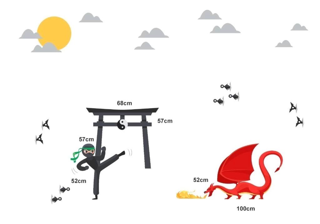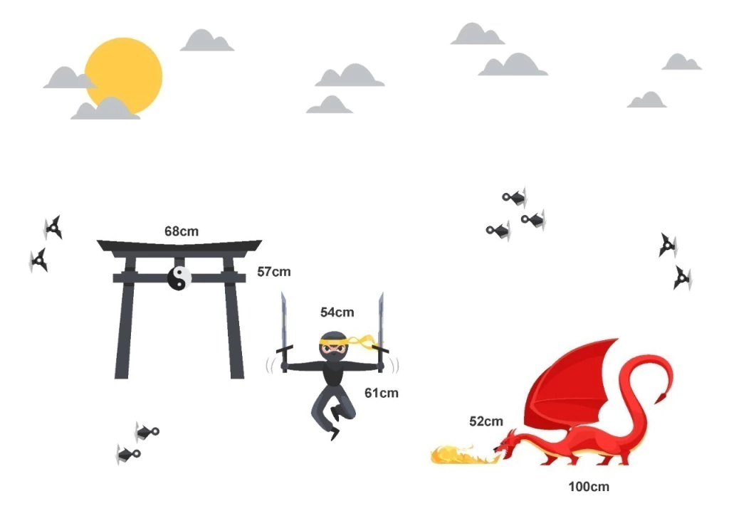 Opção 1: Tamanho G - 4 ninjas, portal, dragão, elementos de luta, nuvens e sol.
