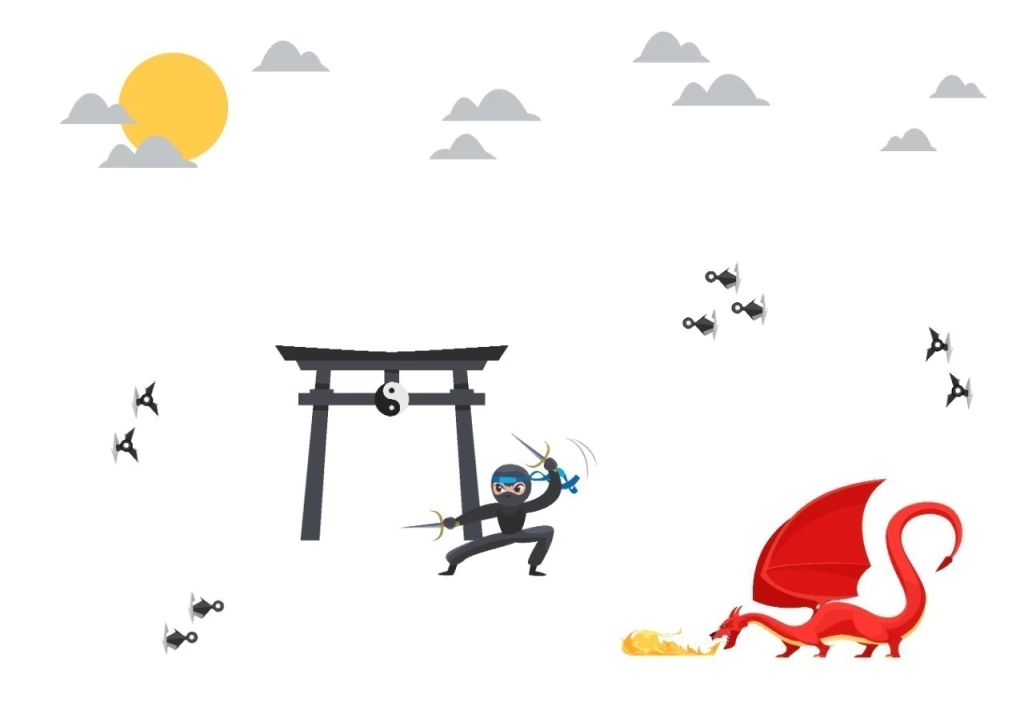 Opção 2: Vermelho - 1 ninja com bandana vermelha, portal, dragão, elementos de luta, nuvens e sol.