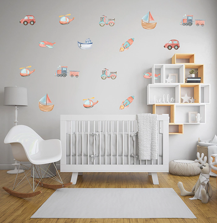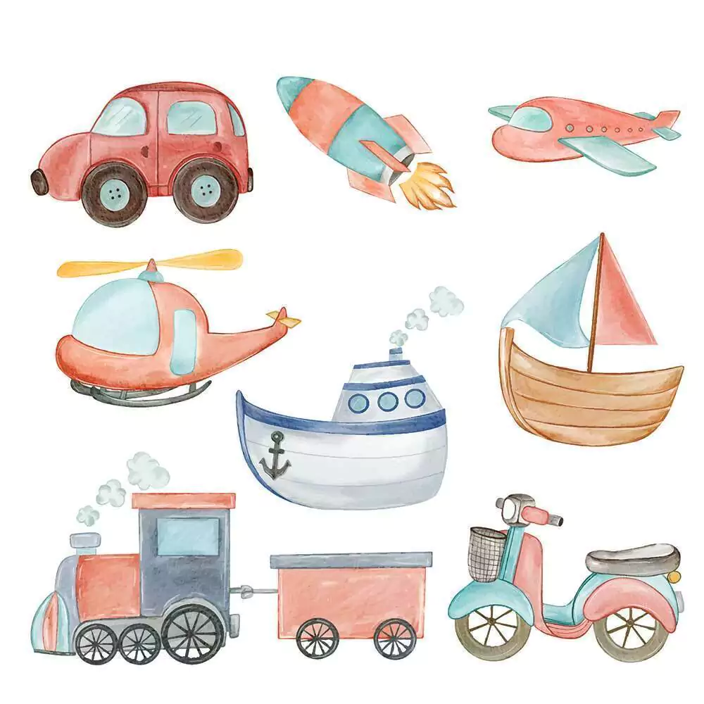 O adesivo Transportes em Aquarela traz um toque delicado e colorido para quartos de bebês e crianças. Com seu estilo artístico em aquarela, cria um ambiente acolhedor e estimulante para os pequenos que amam veículos e aventuras.